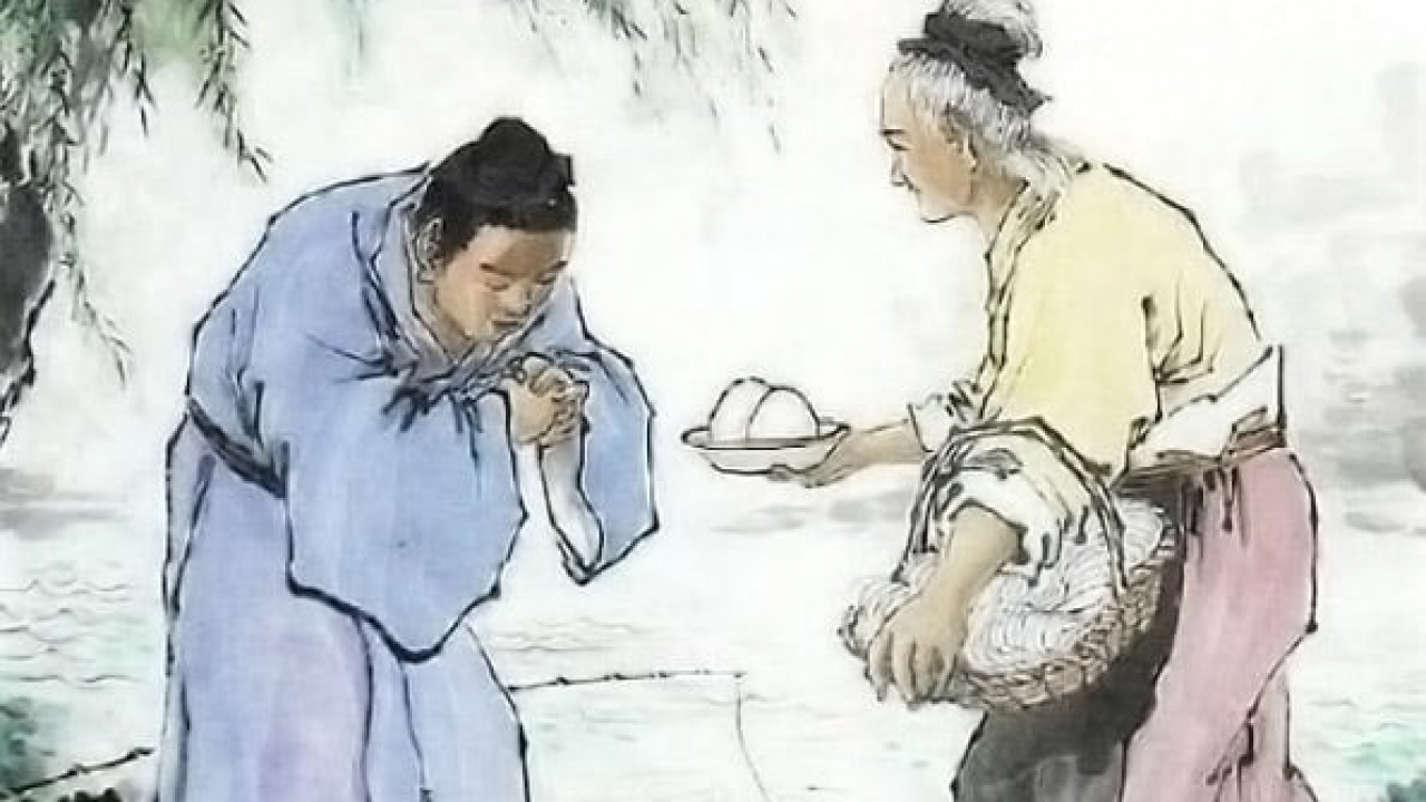 Hàn Tín, đại danh tướng của nhà Hán trước khi thành danh từng lang thang ở đầu đường xó chợ, cũng từng muốn tìm đến cái chết để kết thúc cuộc đời nhàm chán vô vị của mình. Một bà lão giặt vải ở bờ sông vì thương xót ông nên mỗi ngày đều để dư ra một bát cơm mang đến cho Hàn Tín ăn, cứ liên tục như vậy mấy chục ngày liền.